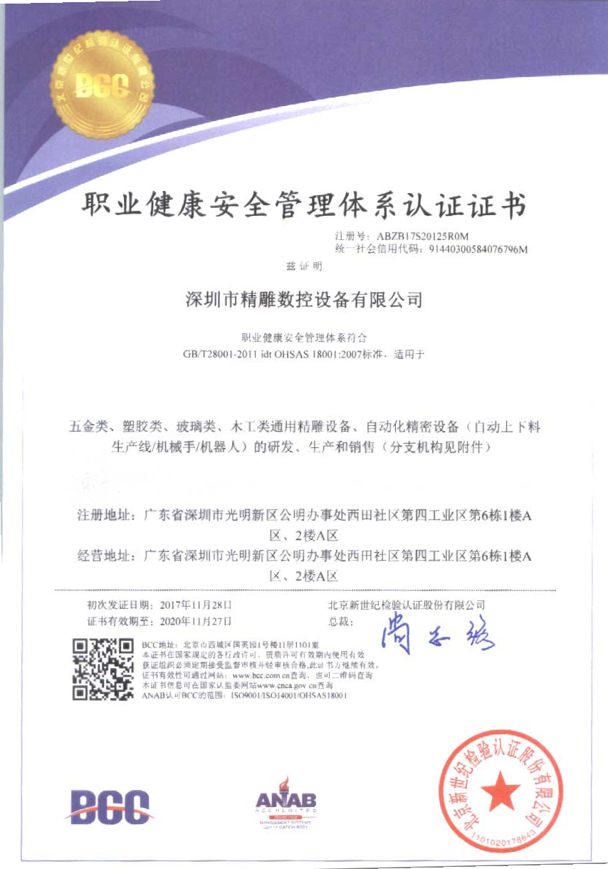 深圳市精雕數(shù)控設(shè)備有限公司,取得,職業(yè)健康安全 管理體系,環(huán)境管理體系,質(zhì)量管理體系三大證書。